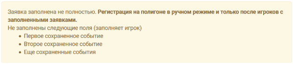 После включения модуля регистрации игроки в принятых заявках увидят уведомление о том, насколько их заявки готовы к регистрации на полигоне. Уведомления бывают следующих типов: