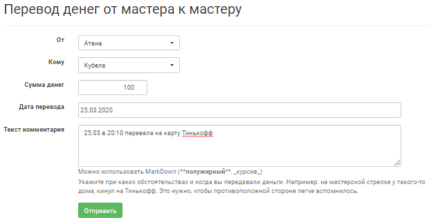 Внутри мастерской группы часто возникает необходимость передать деньги от мастера (например, если разные мастера принимают взносы или, наоборот, разные мастера тратят деньги). Функционал joinrpg.ru позволяет отмечать такие переводы и учитывать их в сводке по бюджету проекта. В разделе Финансы/АХЧ > Отметить перевод заполните все имеющиеся поля, после чего нажмите «Отправить».