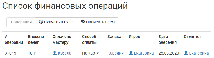 Если у мастера остались вопросы к игроку по поводу переведенного взноса (например, игрок перевел без согласования меньшую или большую сумму), то рекомендуем в поле комментария задать игроку соответствующий вопрос, а в качестве финансовой операции выбрать пункт «Ничего не делать».