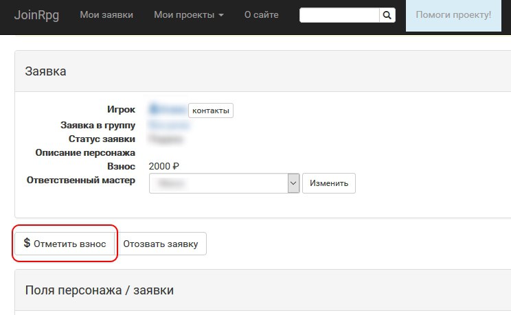 Отмечая взнос в заявке, игрок оставляет информацию для мастера, который принял взнос, и для службы АХЧ, а также заметку «себе на будущее» на случай путаницы. Сдав взнос, зайдите в свою заявку и выберите «Отметить взнос». Через какое-то время мастера подтвердят, что всё ОК.